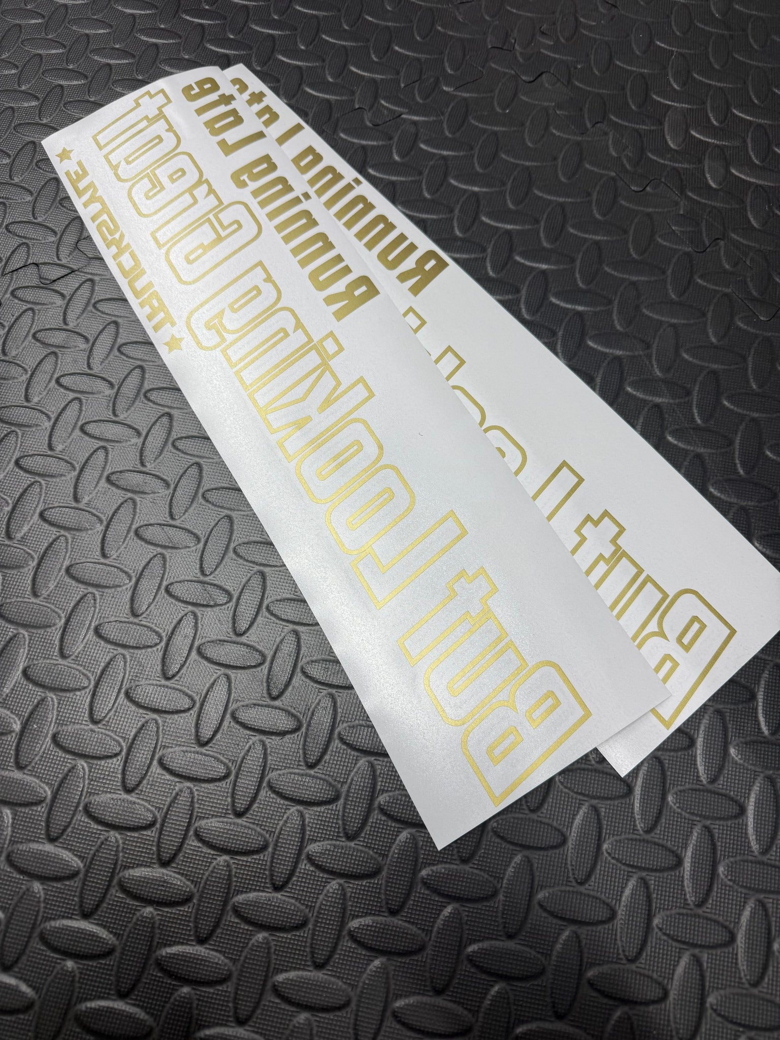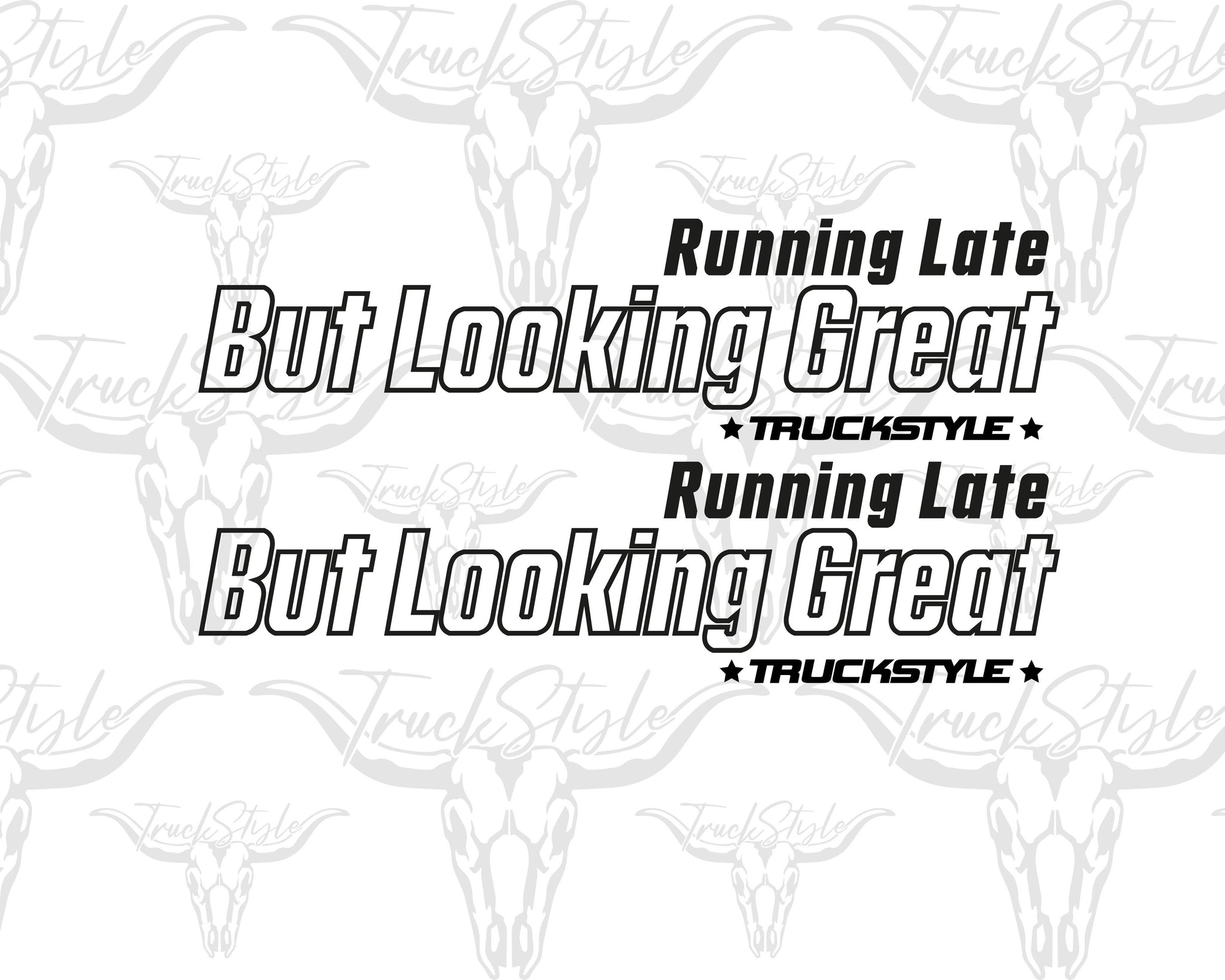 RUNNING LATE BUT LOOKING GREAT OUTLINE SIDE WINDOW STICKERS PAIR X 2